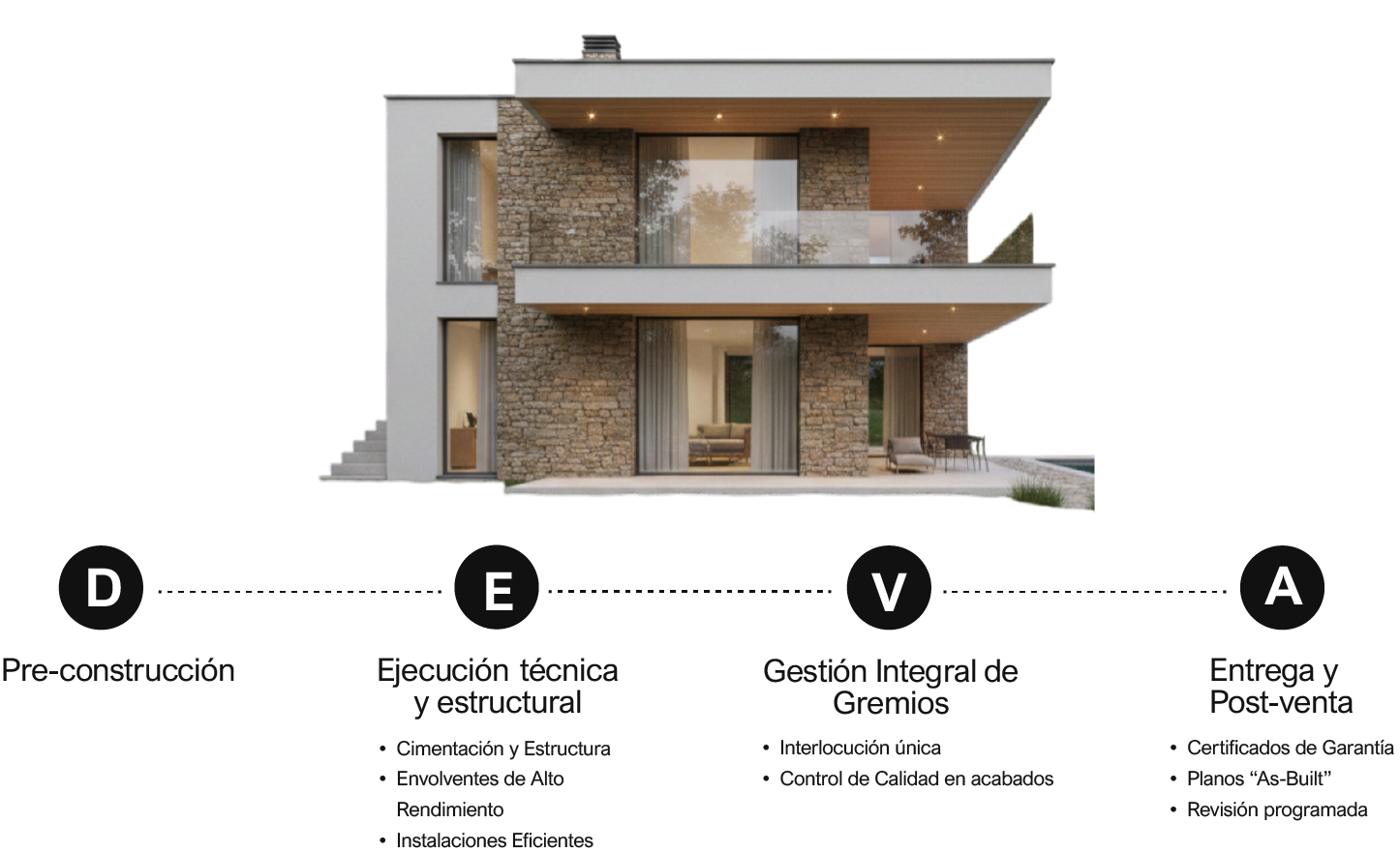 En DEVA Construcción, nos especializamos en la construcción de viviendas unifamiliares, pero nuestra oferta de servicios va más allá. Nos enorgullece ofrecer una variedad de opciones que se adaptan a las distintas fases de la construcción y a los requisitos específicos de cada cliente.
